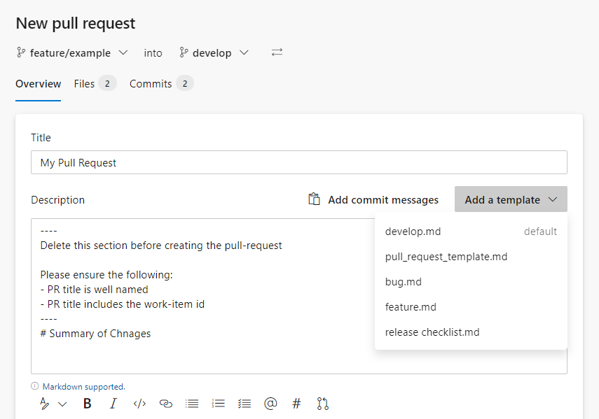 Not many folks realize that Azure DevOps supports pre-populating your pull request with a default template. It can even provide customized messages for specific branches. And because Pull Requests for Azure Repos support markdown, you can provide a template that encourages your team to provide the right amount of detail (and look good, too).