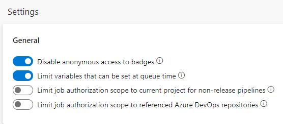 Table of Contents The Azure DevOps Security API is quite interesting as security can be applied to various areas of the platform, including permissions for the project, build pipeline, service-connection, git repositories, etc. Each of these areas support the ability to assign permissions for groups or individuals to a security token. In some cases these tokens are hierarchical, so changes made at the root are inherited on children nodes. The areas that define the permissions are defined as Security Namespaces, and each token has a Security Access Control List that contains Access Control Entries.